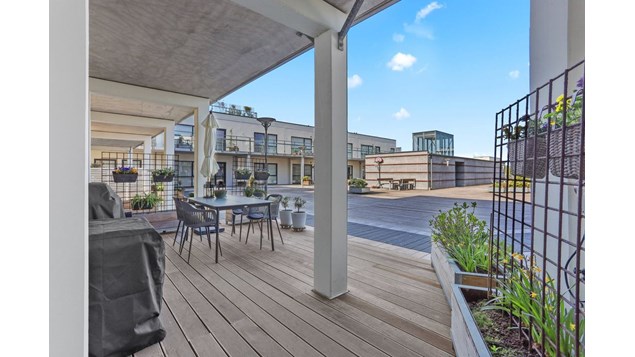 Denne stilfulde lejlighed tilbyder en enestående kombination af gode detaljer, egen terrasse og en privilegeret placering tæt ved vandet.